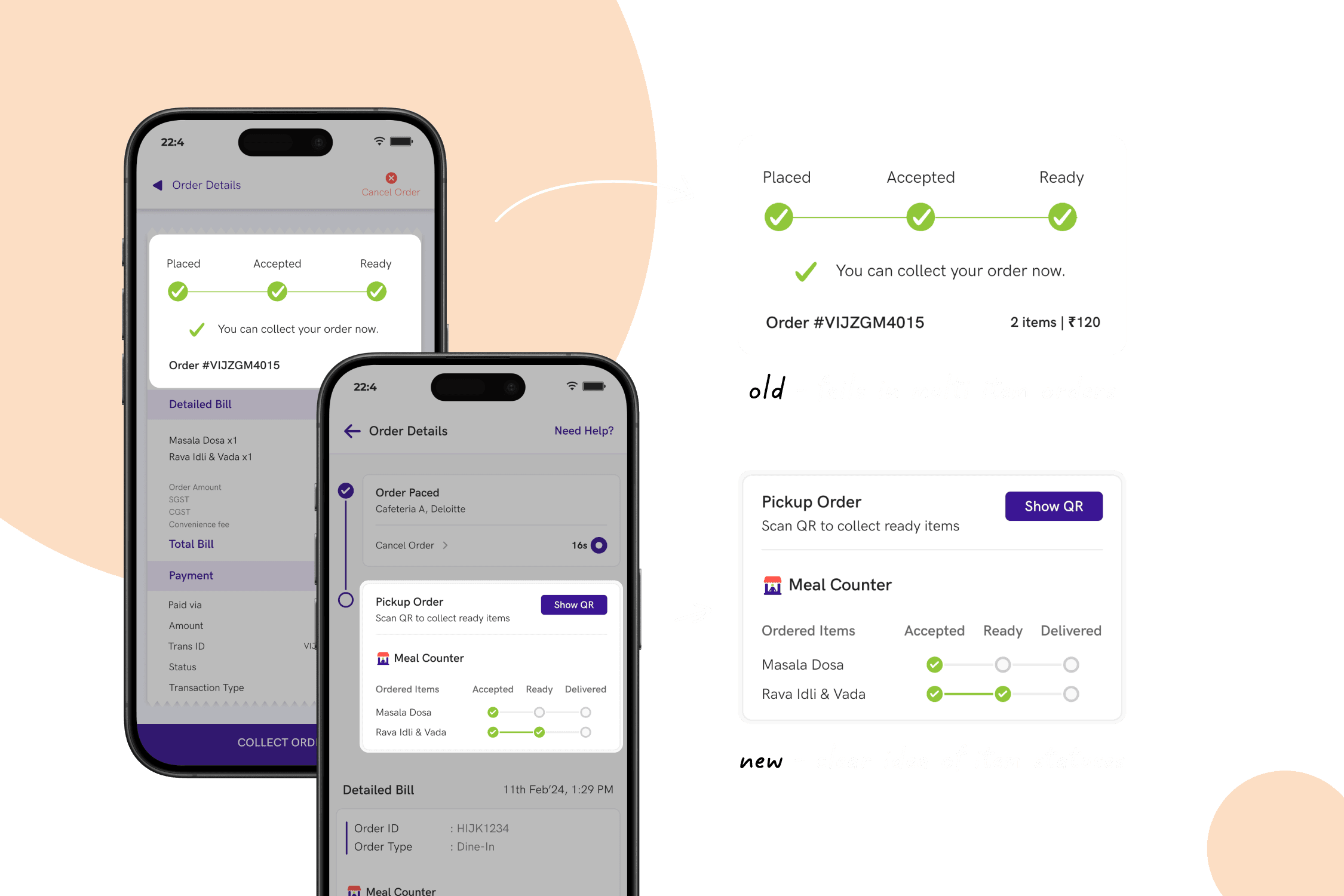 Previously, the app lumped orders into one block. Users had no idea which items were ready. We redesigned it so each item had its own status - accepted, cooking, ready, or canceled.