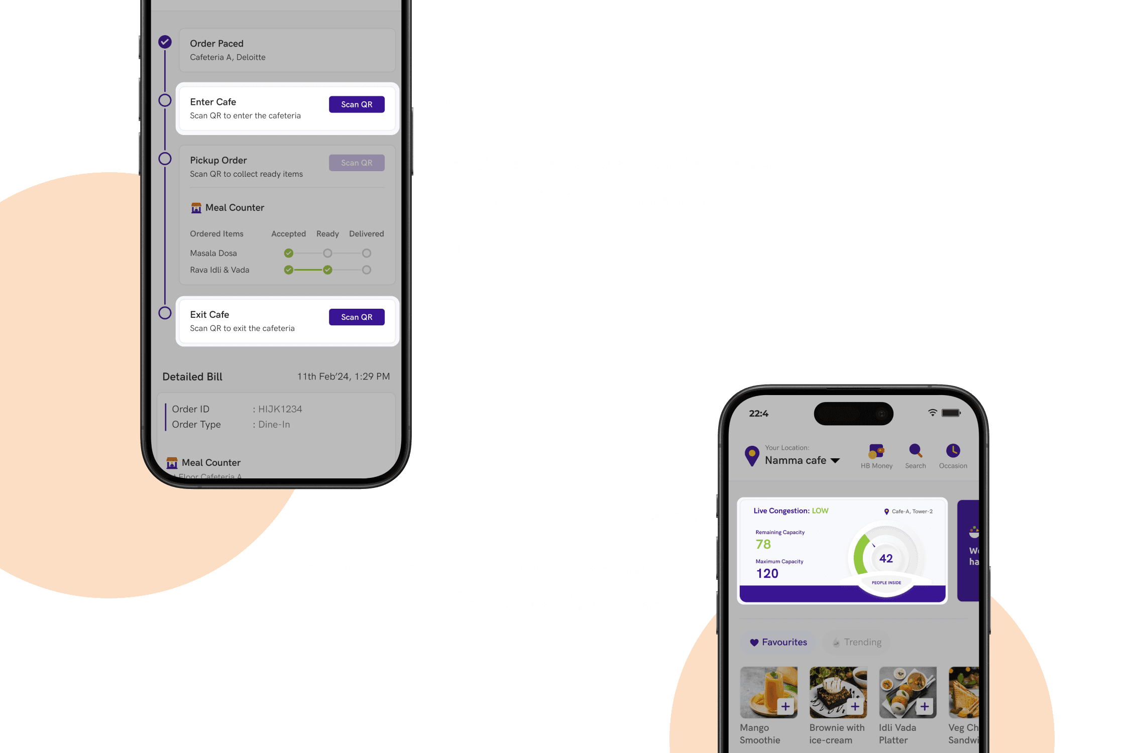 QR-based entry/exit scanners fed real-time cafeteria density data.