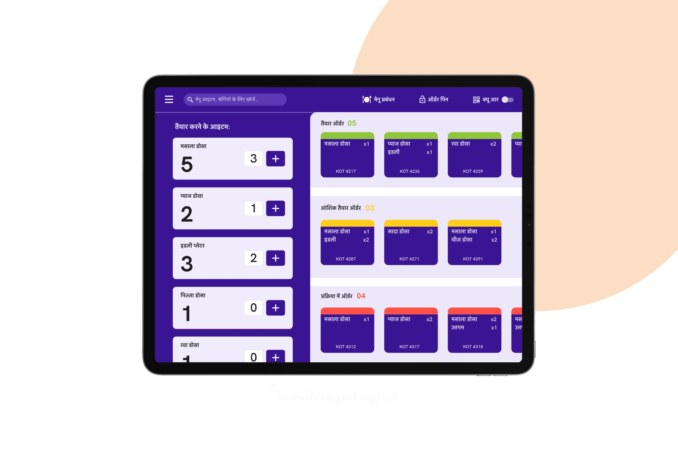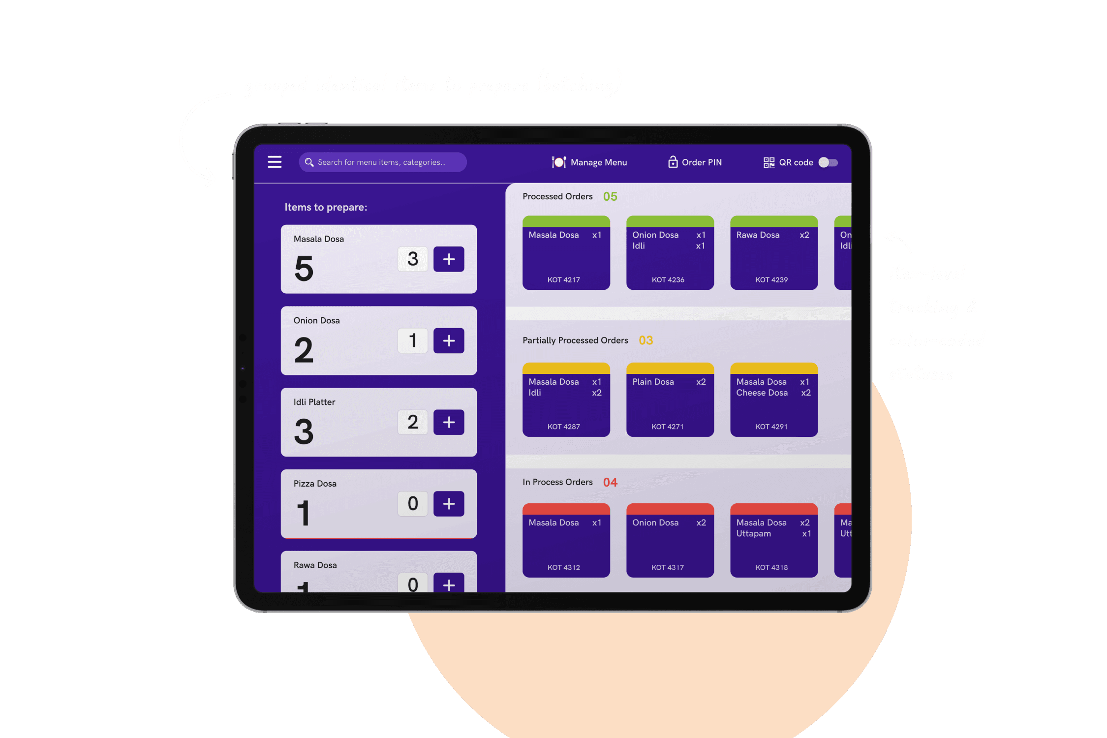 Batching → Group identical items across orders (“20 dosas”) instead of showing them separately.